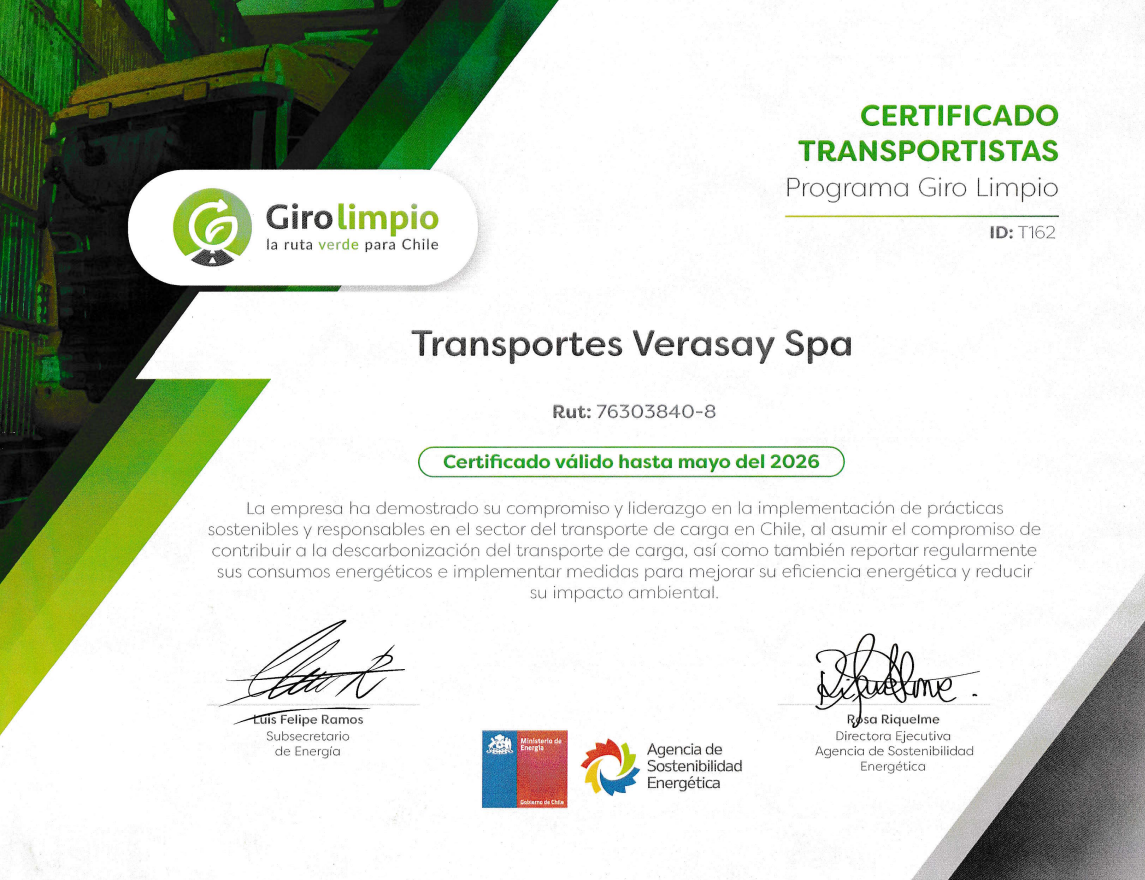 Transportes Verasay es reconocida en la Ceremonia de Certificación 2025 del programa Giro Limpio .